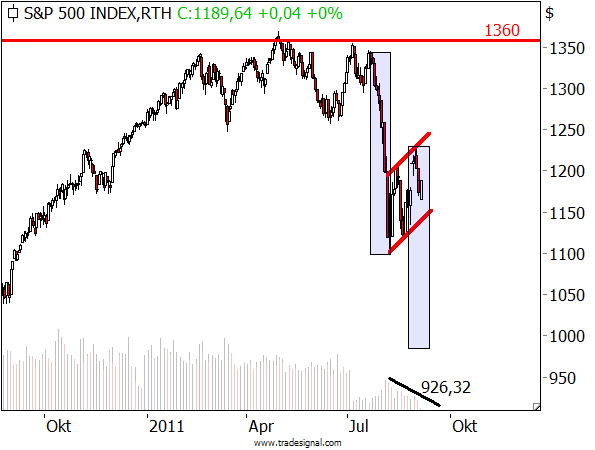 Bricht dann die untere Begrenzung der Flagge (untere rote Linie) muss mit weiteren dynamischen Kursverlusten gerechnet werden. Häufig tauchen solche Flaggen auch in der Mitte einer Bewegung auf (das würde einem weiteren Kursverfall bis zur 1.000-Punkte-Marke entsprechen).