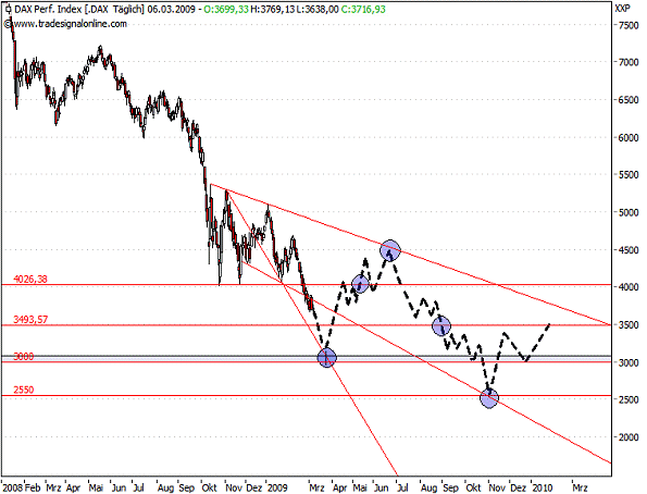 Ebenso würde das eigentliche Tief des DAX nicht bei 2.200 Punkten wie im Jahr 2003 liegen, auch das erwarten zu viel Analysten. Der DAX würde sich um die 2.500er Marke herum endgültig stabilisieren. Bei diesem Tief haben wir allerdings noch das Problem den zeitlichen Rahmen zu bestimmen, da uns in dieser weiten Zukunft die Bezugstargets ausgehen. Eigentlich müsste man das letzte Target sogar eher im Bereich des Jahreswechsels einzeichnen. Das widerspricht jedoch den saisonalen Verläufen. Deswegen haben wir uns für die oben eingezeichnete Variante entschieden.