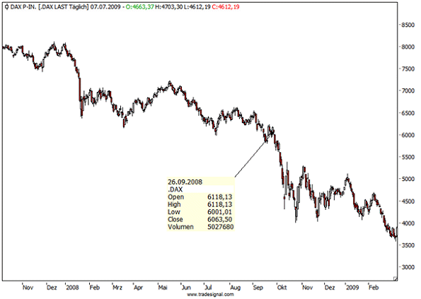Als Bundeskanzlerin Merkel sich dann wiederum etwas später dazu berufen fühlte, eine Garantie für die privaten Spareinlagen zu geben, war klar, dass etwas Großes im Hintergrund schief gegangen sein musste. Man muss schließlich nur dann etwas „garantieren“, wenn eine Unsicherheit besteht. Spätestens damit wurde deutlich, dass die Krise auch in Deutschland angekommen war. Wenige Tage später bildete der DAX allerdings auch schon sein erstes Tief aus.