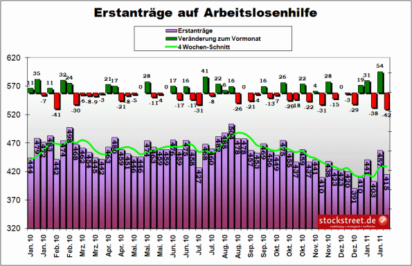 Jetzt wird es undurchsichtig. Die Erstanträge auf Arbeitslosenhilfe sind stärker zurückgekommen, als von Analysten gedacht. Sie fielen um satte 42.000 auf 415.000 Stellen. Analysten hatten im Schnitt mit 420.000 Stellen gerechnet. Das ist im Zusammenhang mit dem US-Arbeitsmarktbericht, der morgen veröffentlicht wird, eher wieder ein positives Zeichen.