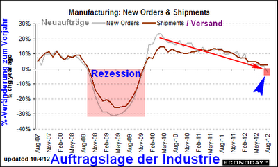 Die jüngste Prognose der Weltbank hat die Wachstumsraten für dieses Jahr und auch für 2013 etwas zurückgenommen. Mit einer globalen Rezession wird jedoch nicht gerechnet. Die Auftragslage der amerikanischen Industrie hat seit dem ersten Quartal 2010 nachgelassen (roter Pfeil) und liegt momentan unter dem Vorjahresniveau (blauer Pfeil). Unmittelbar nach der Rezession von 2008/2009 war es zu deutlichen Verbesserungen gekommen. Davon ist jetzt kaum noch etwas zu verspüren.