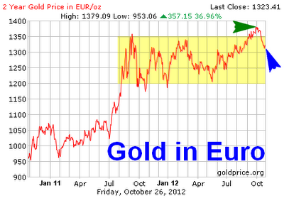 Der Goldpreis stieg auf Euro-Basis auf ein neues Rekordhoch Anfang Oktober (grüner Pfeil). Seitdem ist der Goldpreis wieder in den horizontalen Trendkanal (gelbe Schattierung) zurückgefallen. Kommt es zu keinem erneuten Ausbruch über die Euro 1.350-Marke in den nächsten Wochen, so ist mit einem weiteren Verkaufsdruck zu rechnen.