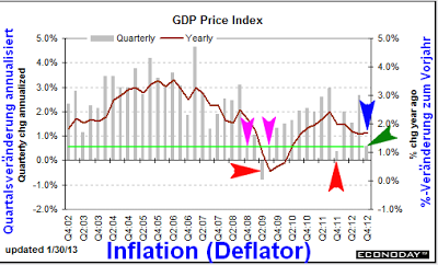Das Inflationsthema taucht zwar immer wieder auf, jedoch stellt Inflation keine aktuelle Gefahr dar. Im vierten Quartal fiel der Deflator mit 0,6% (grüner Pfeil) auf ein Niveau (hellgrüne Linie), das es in den vergangenen 10 Jahren nur zweimal gab (lila Pfeile) und nur zweimal unterschritten wurde (rote Pfeile). Gegenüber dem Vorjahr liegt die Preissteigerung deutlich unter 2% (blauer Pfeil).