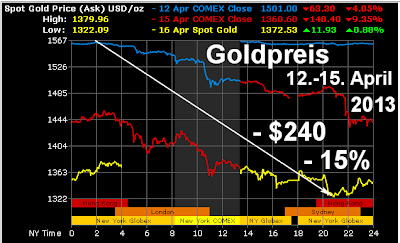 Der Goldpreis fiel um $240 innerhalb von nur zwei Tagen in Hong Kong (weißer Pfeil), was einem Minus von 15% entspricht. Dies war der größte zwei Tages-Verlust in 33 Jahren.