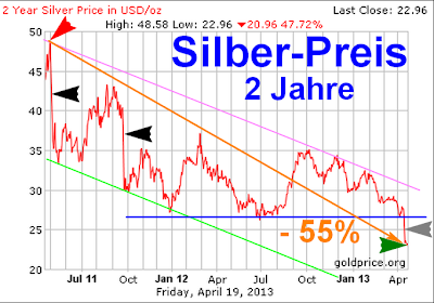Seit dem 28 April 2011, als Silber auf $49,5 gestiegen war (roter Pfeil), befindet sich der Silberpreis in einem breiten Abwärtstrend markiert durch die rote und hellgrüne Linien. Der größte Preis-Einbruch von 33% innerhalb von nur sechs Börsentagen kam vor zwei Jahren Ende April bis Anfang Mai (erster schwarzer Pfeil). Der zweite Einbruch folgte Ende September 2011, als der Verlust innerhalb von nur drei Tagen 30% erreichte (zweiter schwarzer Pfeil). Im Vergleich dazu war der Preisrückgang von 20% (grauer Pfeil) innerhalb von zwei Börsentagen (12. und 15. April) vor einer Woche "relativ" gering. Allerdings wurde damit eine wichtige Unterstützung um $26 (blaue Linie) deutlich unterschritten. Der Preisverfall seit Ende April 2011 liegt bei 55% (orange Pfeil). Der aktuelle Silberpreis um $23 ist dabei noch nicht der Tiefstand in diesem Jahr!