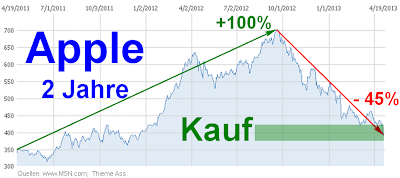 Die Apple Aktie liegt jetzt 45% unter seinem Rekordhoch vom September vergangenen Jahres. Mein Kaufbandbreite habe ich reduziert auf $425 bis hinunter zu $375 (grüne Schattierung). Mein Kursziel bleibt jedoch $600 bis $650 in den kommenden 12 Monaten, auch wenn es jetzt sehr ambitiös erscheint. Details dazu diskutiere ich auf meiner Hotline. Vor zwei Jahren notierte die Aktie um $350 und verdoppelte sich innerhalb von nur 17 Monaten (grüner Pfeil).