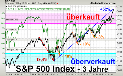 Der S&P 500 Index befindet sich seit einigen Wochen in einem "überkauft" Zustand (lila Schattierung). Dies wird durch die grüne Linie angezeigt, die den Prozentsatz der Aktien über der 200-Tageslinie angibt. Zur Zeit sind es fast 90% der 500 Werte, die in diesem Index enthalten sind. Nach einer solchen Übertreibung folgt fast ausnahmslos eine Konsolidierung bis hin zu einer Korrektur (drei orange Pfeile). Im Sommer 2011 kam es sogar zu einer Baisse mit einem Minus von fast 20% (roter Pfeil), nachdem die Börse rund sieben Monate "überkauft" war (grüne Linie). Eine ideale Kaufchance gab es im August/September 2011, als der Index in die "überverkauft" Zone fiel (hellblaue Markierung). Seit Anfang Oktober 2011 ist der S&P 500 Index um 52% gestiegen. Meine damalige Kaufempfehlung traf ins Schwarze.