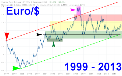 Der Euro wurde als Buch-Währung im Januar 1999 eingeführt. Euro-Scheine und Münzen gibt es seit 2002. Der Wechselkurs zum US-Dollar hat in den vergangenen 15 Jahren deutliche Schwankungen erlebt. Die Erstnotierung des Euro lag bei knapp $1,18 (roter Pfeil). Ich empfahl damals, Dollar zu kaufen. Ende Oktober 2000 fiel der Euro auf fast $0,82 (hellgrüner Pfeil). Bereits ab $0.95 war für mich der Euro interessant. Danach kam es zu einer deutlichen Euro-Aufwertung, die Mitte Juli 2008 bei knapp $1,60 ihren Höhepunkt erreichte (lila Pfeil und Schattierung). Etliche Prognosen nannten einen Wechselkurs von zwei Dollar zum Euro. Die Kaufkraft wurde dabei vollkommen außer Acht gelassen. Meine damalige Kaufempfehlung für den Dollar wurde belächelt.