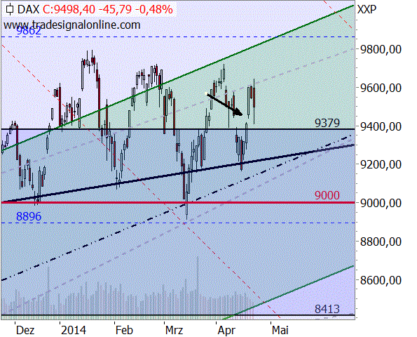Beides ist regelkonform. Ein erstes Warnzeichen entsteht erst dann, wenn die 9.379er Marke wieder nach unten gebrochen wird. Dieses leicht bearishe Signal würde bestätigt, wenn die schwarze, strichpunktierte Linie fällt. Doch wirklich bearisher wird es erst, wenn danach auch noch die 8.896er Marke nicht halten sollte. Dazu aber dann mehr.