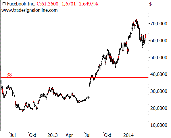 Aber genau hier verbirgt sich eine so typische Fehlerquelle unerfahrener Anleger. Schauen Sie sich den Chart an: Der Kurs läuft der positiven Entwicklungen voraus. Die imposante Rally seit Mitte 2013 hatte einen Grund. Einen Grund, den man jetzt in den aktuellen Zahlen erkennen kann. Die Anleger, die damals kauften, haben darauf spekuliert, dass Facebook es schaffen wird. Diese Spekulation ist jetzt aufgegangen. Diese Zahlen sind damit aber "abgefrühstückt" - das Rennen somit vorbei.