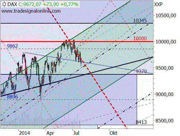 Während die US-Indizes noch dicht unter ihren Hochs notieren, konsolidiert der DAX weiter vor sich hin. Und das natürlich passend und sehr genau an der schon seit Wochen vorgestellten Konsolidierungslinie nach der Target-Trend-Methode (dicke, rot gestrichelte Linie im folgenden Chart):