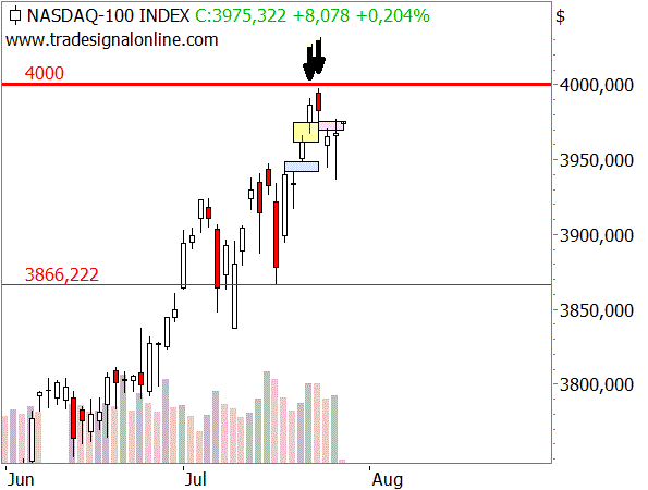 Bei der Frage, ob der DAX auch noch bis zur unteren Linie des ehemaligen Aufwärtstrendkanals fällt, also durch die Mittellinie nach unten bricht, würde man normalerweise die US-Indizes zu Hilfe nehmen. Allerdings gibt es dabei ein gewisses Problem: Die US-Indizes haben sich in den vergangenen Monaten komplett anders entwickelt als der DAX. Während der DAX an der 10.000-Punkte-Marke scheiterte, stiegen die US-Indizes immer weiter an. Erst jetzt, wo der S&P500 die psychologisch wichtige 2.000er Marke und der Nasdaq100 die 4.000er Marke erreicht hat, senden die US-Indizes erste Schwächesignale. Dazu der Nasdaq100: