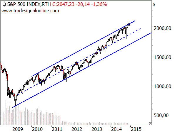 Eine andere Möglichkeit besteht allerdings ebenfalls: Dadurch, dass der S&P500 sich bereits seit Monaten an der oberen Begrenzungslinie nach oben hangelt, steigt die Wahrscheinlichkeit, dass er eine Art Trendbeschleunigung versucht. Trendbeschleunigung heißt, er verlässt diesen alten "flachen" Trendkanal und bildet einen neuen, steileren Trendkanal aus. Doch dazu muss der S&P500 natürlich erst einmal die obere Begrenzungslinie nachhaltig überwinden. Und das ist bisher nicht der Fall. Insoweit ist die Wahrscheinlichkeit einer Konsolidierung immer noch leicht höher.