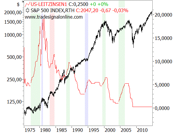 Insgesamt zeigt sich, dass nur einmal, und zwar in den 1980er Jahren, der Markt bei einer kurzen Phase steigender Zinsen gefallen ist, ansonsten hat er sich zumindest gehalten oder ist sogar in den überwiegenden Fällen weiter gestiegen. Insoweit muss man sich keine so großen Sorgen machen. Das gilt insbesondere in der Anfangsphasen steigender Zinsen, da, wie gesagt, der Markt in dieser Zeit durch die immer noch sehr expansive Geldpolitik unterstützt bleibt.