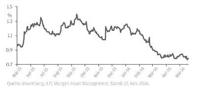Im Juni wird die Europäische Zentralbank (EZB) erstmals Anleihen kaufen, die von Unternehmen außerhalb des Finanzsektors begeben wurden. Wie die unten stehende Grafik zeigt, ist es der EZB auch ohne den Kauf eines einzigen Wertpapiers gelungen, die Renditen der Unternehmensanleihen fast auf Rekordtiefs zu drücken. Allein das Potenzial massiver Käufe auf dem Corporate-Markt hat dazu geführt, dass nun auch diese Anlageklasse neuerdings negative Renditen verzeichnet. Bei Unternehmensanleihen aus der Eurozone hat der Anteil der Titel mit Negativzinsen inzwischen einen Rekordwert von 2% des Index erreicht. Dieser Prozentsatz wird wahrscheinlich noch steigen, sobald sich das Ankaufprogramm der EZB in den kommenden Monaten beschleunigt. Neben den Unternehmensanleihen, die davon natürlich profitieren, dürfte dies auch europäischen Hochzinsanleihen und Aktien zugutekommen.