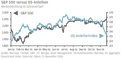 Die Investoren rätseln noch immer darüber, was eine Präsidentschaft Donald Trumps für die Märkte bedeutet. Klar ist, dass das Wachstum während Trumps Amtszeit nicht mehr von der Geldpolitik, sondern von fiskalpolitischen Maßnahmen bestimmt werden dürfte. Wie die folgende Grafik zeigt, hat der bevorstehende Machtwechsel zu einer deutlichen Divergenz zwischen Aktien und Anleihen geführt. Im Jahresverlauf hatten sowohl die Aktien- als auch die Anleihenmärkte lange Zeit von der lockeren Geldpolitik profitiert. Ganz so großzügig ist die Fiskalpolitik freilich nicht. Die Aussicht auf höhere Infrastrukturausgaben und Steuersenkungen wird 2017 wahrschein-lich das Wachstum ankurbeln. Das ist gut für US-Aktien, die in der vergangenen Woche neue Re-kordstände erreichten. Eine fiskalische Expansion könnte allerdings einen Preisauftrieb und eine entsprechend restriktive Geldpolitik zur Folge haben - schlechte Nachrichten für die US-Anleihen-märkte, die voraussichtlich den schlechtesten Monat seit der Finanzkrise verzeichnen werden.