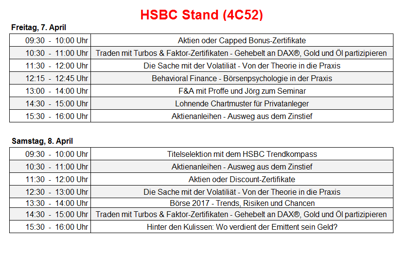 | Diskutieren Sie mit den Experten und Händlern von HSBC und erfahren Sie Hintergründe und Details zur Technischen Analyse, verschiedenen Anlagestrategien, kurzfristigem Trading, sowie Möglichkeiten im Niedrigzinsumfeld eine Rendite zu erzielen.