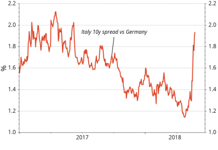 Entwicklung von Spreads zwischen Italienischen und Deutschen 10J-Staatsanleihen: Italienische Staatsanleihen brachen nach der Wahl ein, während deutsche Staatsanleihen aufgrund von Save-Haven-Nachfrage steigen.