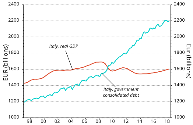 Die folgende Grafik zeigt, dass das reale Bruttoinlandsprodukt (BIP) Italiens immer noch unter dem Niveau vor der Finanzkrise liegt (rote Linie). Die Staatsverschuldung ist dagegen im gleichen Zeitraum von ca. Euro 1,6 Billionen auf 2,2 Billionen gestiegen (türkisene Linie).