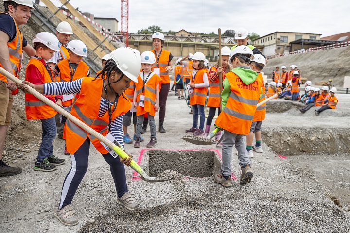 Rund 50 Kinder aus dem Tössfeld feierten die Grundsteinlegung bereits letzte Woche auf ihre eigene Art und Weise. Im Rahmen des Projektes "Raum schaffen" von museum schaffen, vergruben die Mädchen und Jungen Mauersteine, die sie im Sommer 2017 selber in der Lokstadt abgespitzt hatten. Implenia unterstützt das Projekt und museum schaffen im Rahmen einer Kooperation. (Bild: Implenia)