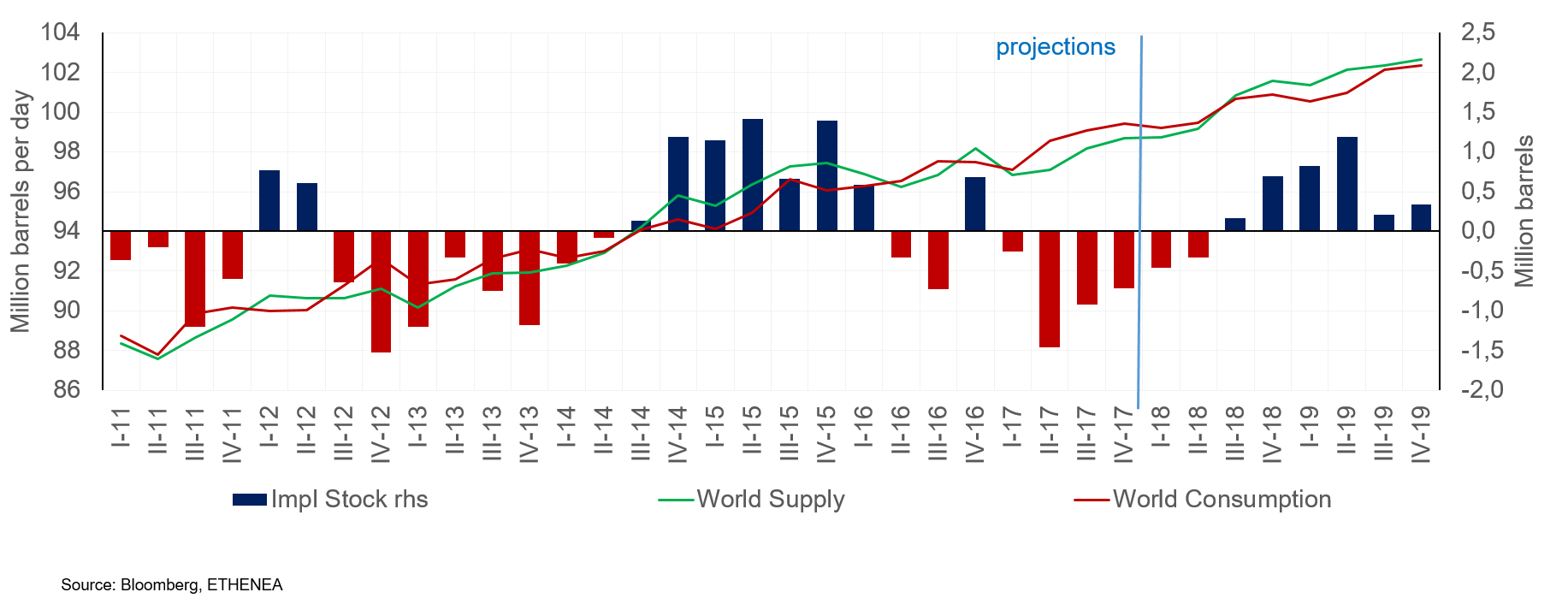 Grafik 6: Angebot und Nachfrage von Rohöl nach Schätzungen der US-Behörde Energy Information Administration
