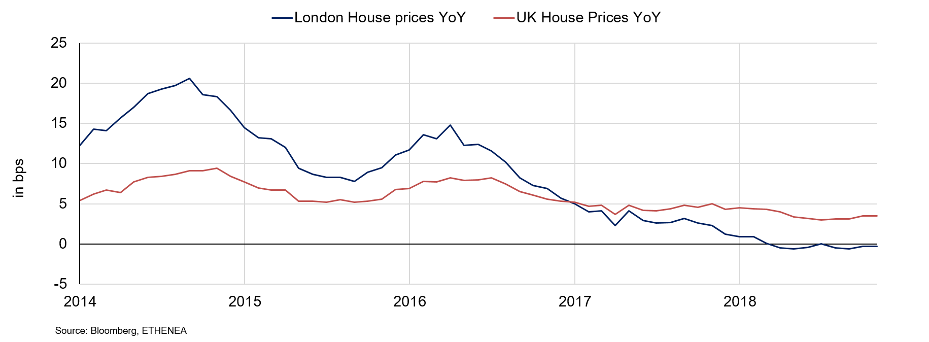 Der Kapitalmarkt allerdings scheint diese Möglichkeit des Exits vom Brexit nicht ernsthaft zu berücksichtigen. Die Prämie für die Kreditausfallversicherung ist zwar am Steigen (siehe Grafik 1), aber immer noch auf tiefem Niveau bei 35 Bp., was einer Ausfallwahrscheinlichkeit von gerade mal 3 % entspricht. Zum Vergleich liegt die Prämie für Italien bei 250 Bp., was eine Ausfallwahrscheinlichkeit von 20 % bedeutet. Mehr Sorgen scheint der Markt eher im Bereich der längerfristigen Inflation zu entwickeln. Der Renditeunterschied zwischen der aktuellen 30- und 10-jährigen britischen Staatsanleihe (siehe Grafik 2) ist deutlich angestiegen, nachdem Theresa May mit der Vereinbarung nach Westminster zurückkehrte. Scheinbar glaubt kaum jemand, dass die Vereinbarung die Zustimmung des Parlaments finden wird. Das Britische Pfund hingegen ist weiterhin stabil (siehe Grafik 3). Bei den generellen Immobilienpreisen ist zwar eine Abkühlung zu verzeichnen, aber lediglich im Raum London scheinen die Hauspreise tatsächlich stärker rückläufig zu sein (siehe Grafik 4). Allerdings hat der Londoner Häusermarkt nach Jahren des zweitstelligen Wertzuwachses vielleicht auch mal eine Abkühlung verdient, ohne dass man in Panik verfallen sollte.