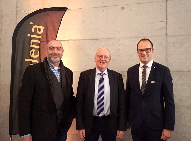Feiern gemeinsam mit allen am Projekt Beteiligten sowie den Handwerkern und Planern das Erreichen des Projektmeilensteins Aufrichte (von l.): Richard Bruggmann, Implenia Projektleiter Ausführung, Günter Heuberger, Verwaltungsratspräsident Siska Heuberger Holding AG, und Adrian Wyss, Implenia Geschäftsbereichsleiter Modernisation & Development.