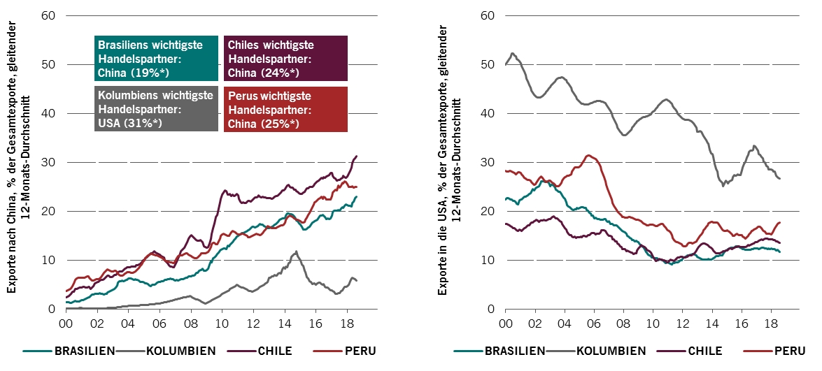 CHINA AUF DEM VORMARSCHEs lauert jedoch eine Gefahr, der sich diese Länder nur schwer entziehen können: ihre zunehmende Abhängigkeit von China bei den Exporten, insbesondere vor dem Hintergrund der aktuell herrschenden globalen Handelsspannungen. Wie in Abb. 3 zu sehen ist, ist China der wichtigste Handelspartner für Brasilien, Chile und Peru.