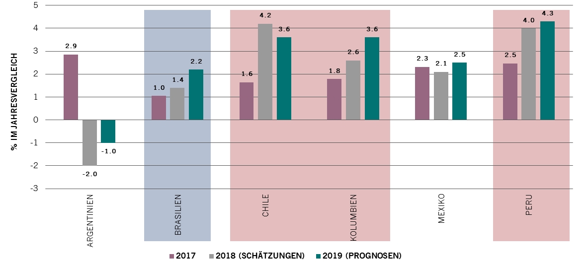Während die Lage für die Schwellenländer insgesamt schwierig ist, sticht Lateinamerika als einzige Region hervor, die sich 2018 besser entwickeln dürfte. Vor allem Brasilien, Kolumbien und Peru sind in puncto Wachstum die vielversprechendsten Märkte (Abb. 1).