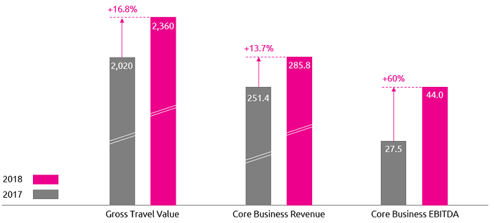 * Das Kerngeschäft umfasst die Ergebnisse von Online-Reiseagentur- (OTA), META- und Mediengeschäft ohne Einmaleffekte und Ergebnisse der Venture-Initiativen (eigenständige Unternehmen, die unabhängig von lastminute.com geführt werden), um die tatsächliche Entwicklung des Kerngeschäfts abzubilden.