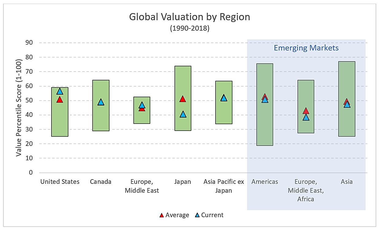 Woran macht man also die Entscheidung fest: Wird 2019 ein gutes Aktienjahr, oder war 2018 nur ein Vorgeschmack auf den großen Rutsch?Wie oben bei Herodot und Tolstoi gesehen, hängt die große Entscheidung, ob man überhaupt in Aktien, Anleihen, Immobilien, Landwirtschaft oder Kunst investiert, von so vielen Unwägbarkeiten und einzigartigen Umständen ab, dass man sie rational nur sehr begrenzt hinterfragen kann und soll. Für die kleine, kurzfristige Entscheidung, ob ich auf Sicht der nächsten Monate die Aktienquote erhöhe, bieten sich rationale Kriterien an. Diese sind derzeit aber wenig aussagekräftig. Die Märkte sind aktuell, wie sich nebenstehender Grafik entnehmen lässt, weder besonders teuer noch besonders billig. Und die Erwartungen sind weder besonders schlecht noch besonders gut. Für große Wetten eignet sich dieses Umfeld nicht. Aber wir haben ohnehin schon öfters darauf hingewiesen, dass Markt-Timing eher etwas für junge Männer und Spekulanten ist als für erfahrene Investoren.