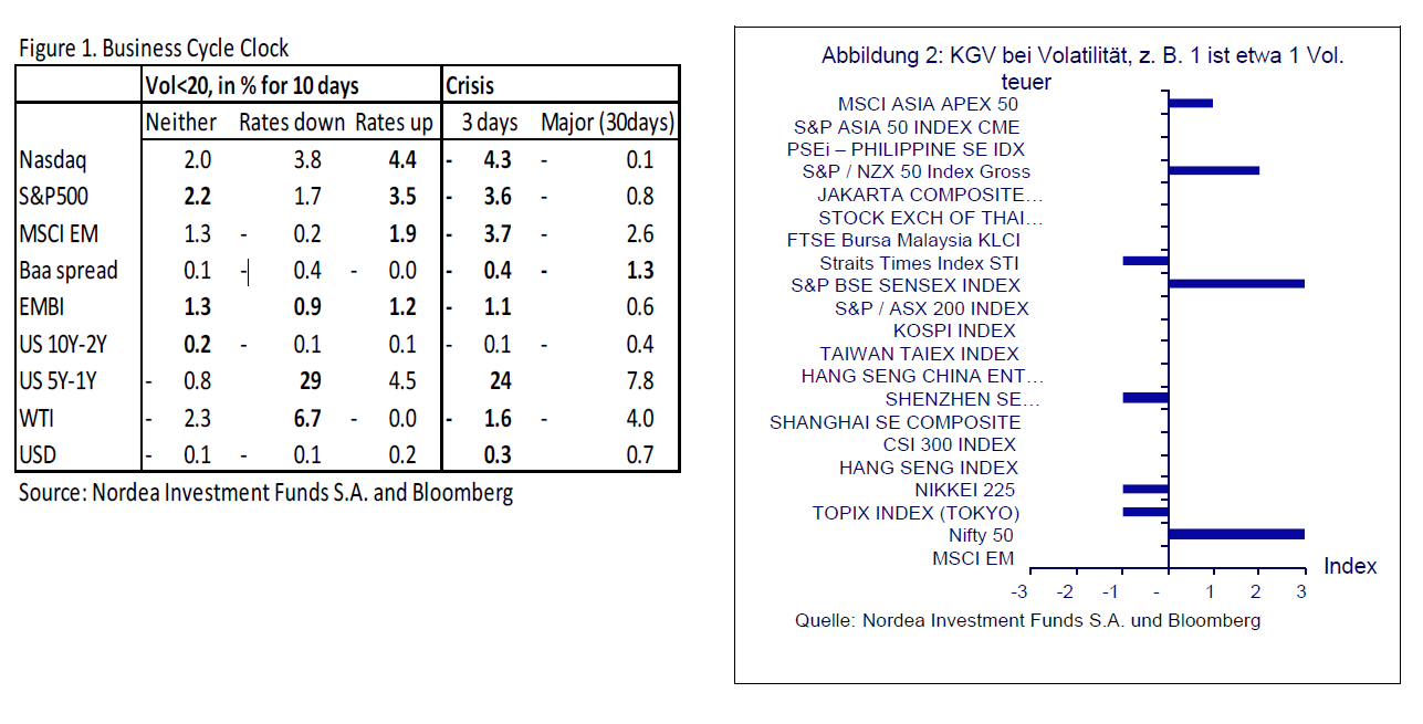 Da die Federal Reserve höchst wahrscheinlich bis kurz vor den Jahreswechsel in Wartestellung verharren wird, besteht weit und breit - sowohl in den Industrie- als auch in den Schwellenländern - die natürliche Tendenz zur Suche nach Renditen. Die europäischen Kreditspreads sind eng, wohingegen die US-Investmentspreads wahrscheinlich schrumpfen werden. Bei Letzteren drehen sich die Sorgen um Unternehmen, die stark fremdfinanziert sind. Ängste vor einem geringeren Wachstum haben einige Unternehmen dazu gezwungen, Schulden abzubauen. Es ist jedoch noch zu früh, um zu sagen, wie sich die Situation weiterentwickeln wird. Zu beachten ist auch, dass in Bezug auf hochrentierliche Ölgesellschaften Anlass zur Sorge besteht, wenn die Ölpreise erneut über einen längeren Zeitraum fallen. Historisch betrachtet wissen wir, dass der S&P 500 im aktuellen und zukünftigen Umfeld gut abschneiden dürfte. Beim Blick auf die Zeile für den S&P 500 in der Konjunkturzyklusuhr (Abbildung 1) kann man sehen, dass die Renditen in einem normalen Volatilitätsumfeld, wenn die Fed in Warteposition ist, über einen 10-Tages-Zeitraum bei 2,2% liegen und statistisch signifikant sind (fett dargestellt). In einem Umfeld, in dem die Fed ihre Geldpolitik lockert, gibt es kein klares Ergebnis. Wenn sie die Zinsen anhebt, liegen die Renditen über einen 10-Tages-Zeitraum bei 3,5%. Dies wäre unser Szenario für die zweite Hälfte des Jahres, allerdings nicht das des Marktes. Im Falle einer Phase der extremen Volatilität mit einem VIX über 30 verliert der S&P 500 3,6% über drei Tage. Hält die Phase länger an, lässt dies nur den Schluss zu, dass sich Schuldtitel schlecht entwickeln.
