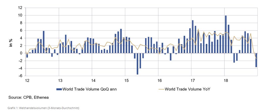Wie wir ja bereits Anfang diesen Jahres geschrieben haben, erwarten wir eine "turbulente Landung¹" der Weltwirtschaft und keine Bruchlandung. Und nachdem wir das erste Quartal hinter uns gelassen haben, muss man sich schon große Mühe geben, die Zeichen der Schwäche zu missachten. Grafik 1 zeigt das Welthandelsvolumen auf Basis der Daten des CPB, des niederländischen Think Tanks für wirtschaftspolitische Analysen, welche als sehr zuverlässig gelten. Um der Volatilität der Datenreihe etwas die Schärfe zunehmen, benutzen wir den Durchschnitt über drei Monate. Aber auch hier kann man eine deutliche Verlangsamung der Handelsströme zum Ende 2018 feststellen, was auch im Einklang mit der aktuell zu beobachtenden globalen Schwäche im produzierenden Gewerbe steht. Der Handelsstreit zwischen China und den USA scheint letztendlich dann doch Spuren zu hinterlassen.