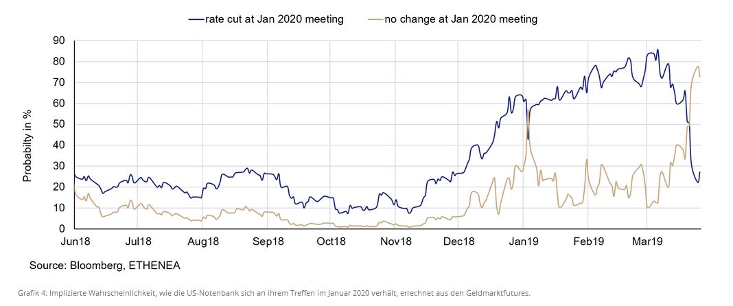 Ein weiteres Indiz für die zukünftige wirtschaftliche Einschätzung der Märkte ist sicherlich auch das Renditeniveau der 10-jährigen Bundesanleihe und der US-Staatsanleihe (siehe Grafik 3). Am Freitag, den 22.3.2019 wurde die aktuelle 10-jährige Bundesanleihe zum ersten Mal seit 2016 mit einer negativen Rendite gehandelt. Dies ist möglicherweise nicht nur der Einschätzung der Märkte im Hinblick auf eine künftige wirtschaftliche Schwäche geschuldet, sondern auch der Angst vor dem möglichen Chaos, falls es doch zu einem ungeordneten Brexit am 12.4.2019 kommt. Die Rendite der 10-jährigen US-Staatsanleihe fiel damit auch unter 2,5 %. Dieses Niveau an sich ist erst einmal nicht so wichtig. Was aber die Marktteilnehmer aufschrecken ließ, war die Tatsache, dass nun zum ersten Mal seit 2006 die Renditekurve in den USA zwischen der 3-Monatsrendite und der 10-Jahresrendite invertierte (siehe Grafik 5). Die vergangen sechs Rezessionen in den USA wurden immer 12 bis 18 Monate im Voraus von einer Inversion der Zinskurve angekündigt. Insofern war die Marktreaktion verständlich, die zukünftigen Leitzinsänderungen der US-Notenbank neu zu bewerten (siehe Grafik 4). Nachdem die Kurve invertierte, hat der Markt (errechnet aus den US-Zinsfutures) die Wahrscheinlichkeit einer Zinssenkung durch die US-Notenbank in ihrer Sitzung Ende Januar 2020 von knapp 50 % auf fast 80 % deutlich erhöht, während gleichzeitig die Wahrscheinlichkeit des Ausbleibens einer Zinsänderung entsprechend fiel!