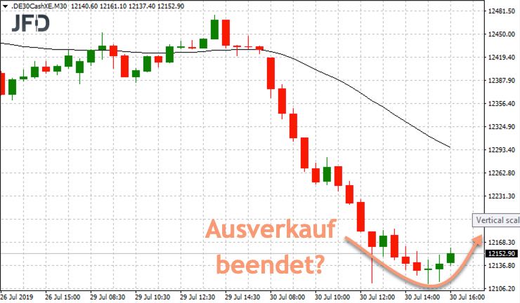 Nach einem recht ruhigen Wochenstart mit Kursen über 12.400 Punkten begann der Deutsche Aktienindex bereits am Dienstag stark zu fallen. Schwache Konjunkturdaten und ein Gewinneinbruch bei der Deutschen Lufthansa verschreckten die Anleger. Die Aktien notierten auf einem Zweieinhalb-Jahres-Tief. Dem gesellte sich auch das Unternehmen Fresenius Medical Care hinzu sowie weitere Nachrichten aus England zum nun harten Brexit. So viele News verdaute der DAX diesmal schwer. Der Druck am Dienstag war so stark, wie seit sechs Monaten nicht mehr. Dabei bildete sich erst um 12.115 Punkte ein zumindest kurzfristiger Boden. Das Momentum des Abverkaufs war damit für die Verhältnisse der letzten Monate sehr hoch und lud nur selten zu einer Gegenbewegung ein. Hierzu ein Chartrückblick vom Mittwochmorgen aus den Tages-Trading-Chancen: