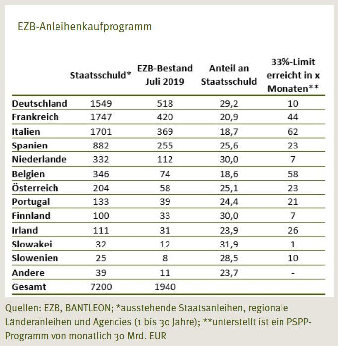 Wie oben ausgeführt, ist eine Neuauflage des Anleihenkaufprogramms wesentlich strittiger als eine Zinssenkung. Wir gehen dennoch davon aus, dass sich am Ende die Tauben um Draghi durchsetzen werden und ein Programm beschliessen, das monatliche Käufe im Umfang von 30 Mrd. bis 40 Mrd. Euro vorsieht. Auf Staatsanleihen ohne supranationale Institutionen dürfte dabei - wie gehabt - ein Anteil von 75% entfallen. Die Laufzeit des Programms sollte bei mindestens sechs bis neun Monaten liegen.