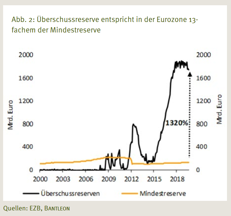 Die Schweizerische Nationalbank (SNB) räumt beispielsweise einen Freibetrag in Höhe des 20-fachen des Mindestreserve-Solls (=Zentralbankgeld, das bei der SNB hinterlegt werden muss) ein. In der Eurozone liegt das Mindestreserve-Soll aller betroffenen Finanzinstitute derzeit bei gut 132 Mrd. Euro (Stand: August 2019). Die Überschussreserven erreichten zuletzt ein Volumen von 1.740 Mrd. Euro, was dem 13u2011fachen der erforderlichen Mindestreserve entspricht (vgl. Abb. 2).