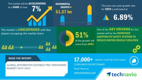 The global automotive seatbelt pre-tensioners market is expected to post a CAGR of over 7% during the period 2019-2023, according to the latest market research report by Technavio. Request a free sample report