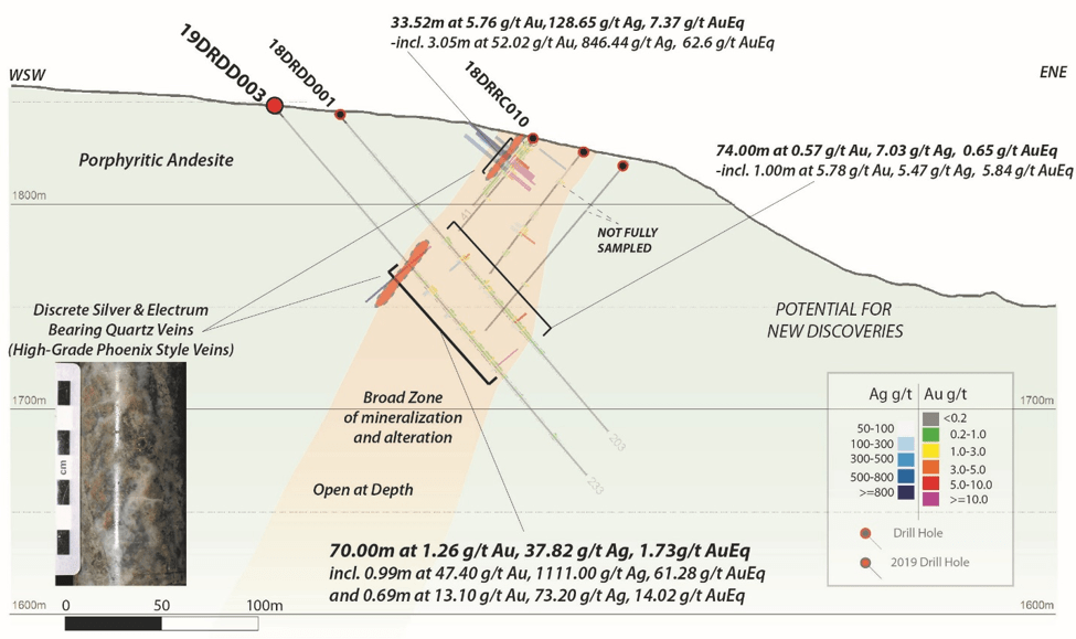 Die hochgradige Gold-/Silbermineralisierung von Dukes Ridge beginnt direkt an der Oberfläche. Bohrloch 18DRRC010 zeigt satte 32,5 Meter mit 7,37 g/t Goldäquivalent und einem Hoch von sagenhaften 62,6 g/t Goldäquivalent. Die darunter liegende Bohrung 18DRDD001 zeigte zwar immer noch eine durchaus ausbeutbare Goldmineralisierung (74 Meter mit einem Höchstwert von 5,84 g/t Goldäquivalent), kam aber an 18DRRC010 nicht heran).