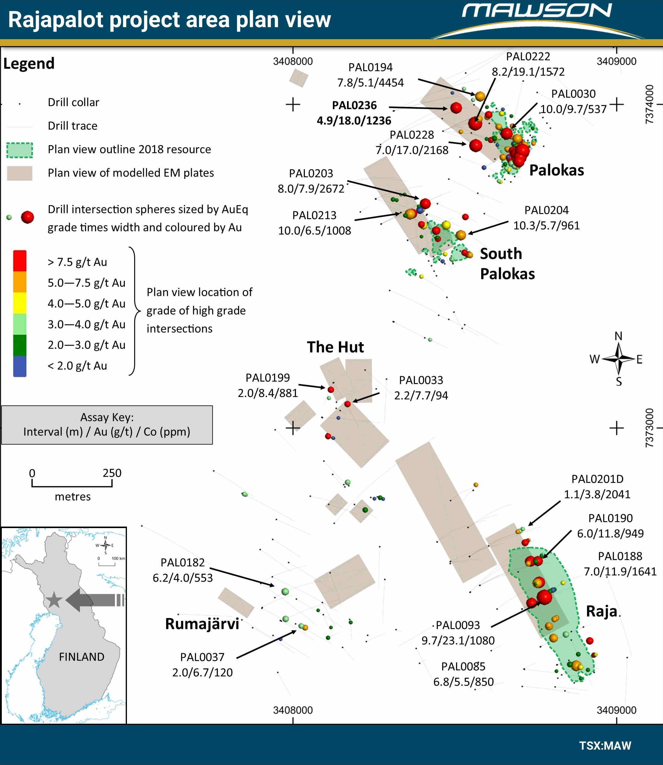 Im tiefsten mineralisierten Abschnitt, der bisher bei Palokas gebohrt wurde, PAL0236, wurden 4,9 Meter mit einem Gehalt von 18,0 g/t Gold, 1.236 ppm Kobalt, 18,8 g/t Goldäquivalent ("AuÄq") ab Meter 449,7 durchteuft, einschließlich 2,0 Meter mit 31,2 g/t Gold ab Meter 452,6. Diese Werte sind wahrlich sensationell und zeigen abermals das unglaubliche Potential, das hier noch im Boden vorhanden ist. Mawson veröffentlicht ein Top-Bohrergebnis nach dem anderen.