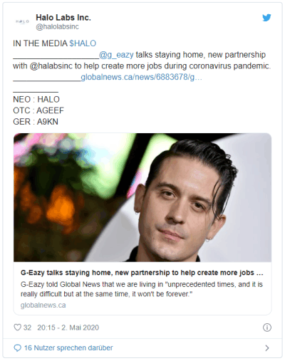Einer der bekanntesten Rapper Kaliforniens, Gerald Gillum aka G-Eazy, wird in Zukunft Markenbotschafter von FlowerShop sein, einer Marke, die vom G-Eazy-Management ins Leben gerufen wurde. Die Cannabisprodukte von FlowerShop werden exklusiv von Halo Labs (WKN: A2JB9L) produziert.