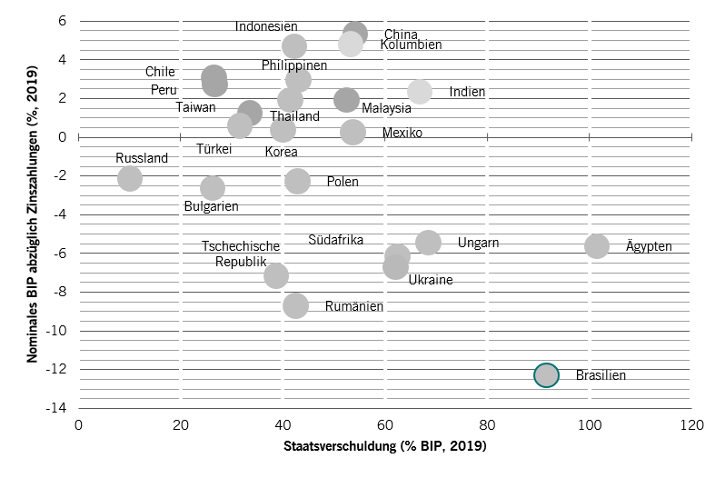 Bereits vor der Pandemie kühlte sich in einigen Schwellenländern das Wirtschaftswachstum ab und erhöhte deren Anfälligkeit. Wie Abb. 1 zeigt, hatten die Länder unten rechts (Brasilien, Ägypten, Ukraine, Südafrika) bei Beginn der Gesundheitskrise nur begrenzten fiskalpolitischen Spielraum, da sie bereits eine hohe Schuldenquote hatten.