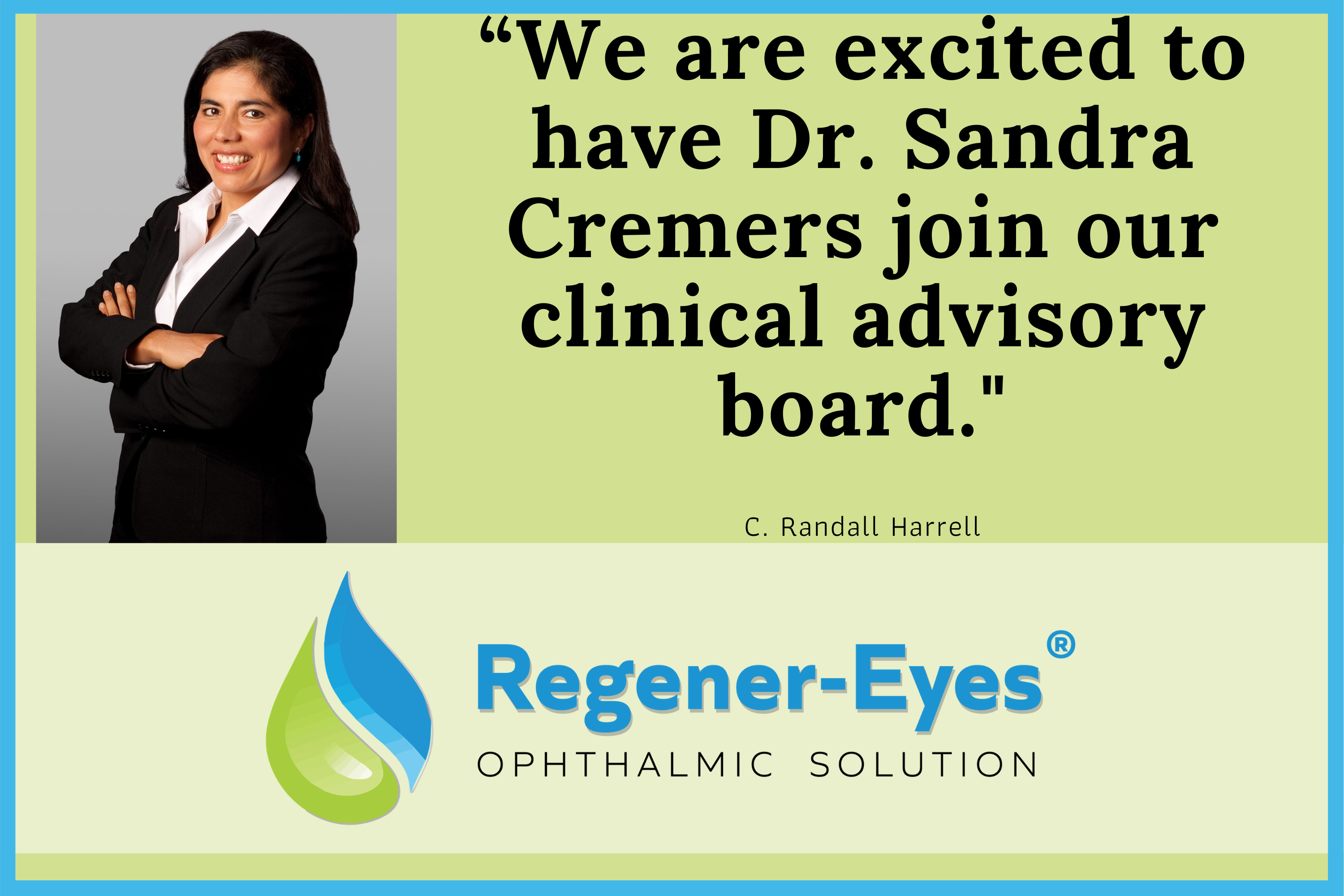 "We are excited to have Dr. Sandra Cremers join our clinical advisory board. She is a highly respected eye care professional, a fellow with the American College of Surgeons, specializing in cataract and pterygium surgery, who will bring valuable insight to our company's efforts," commented C. Randall Harrell, M.D., CEO and Founder of Regener-Eyes®. "We are honored to add Dr. Sandra Cremers to our existing board alongside our other impressive members, Dr. Marguerite McDonald, Dr. Eric Donnenfeld, Dr. Paul Karpecki, Dr. Walt Whitley, Dr. Scott Schacter, Dr. Ahmed Fahmy, Dr. Art Epstein and Dr. Choate."