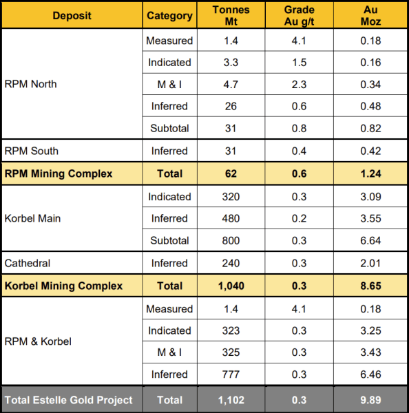 Die Abgeleiteten Ressourcen (Inferred) auf RPM und auch auf Korbel nahmen hingegen ab, da man die Außengrenzen der Goldvererzungen inzwischen konkreter ausgemacht hat. Solche Berichtigungen nach weiteren Bohrprogrammen sind bei Explorern nicht unüblich. Unten ist eine detaillierte Auftsellung der neuesten Berechnung zu sehen.