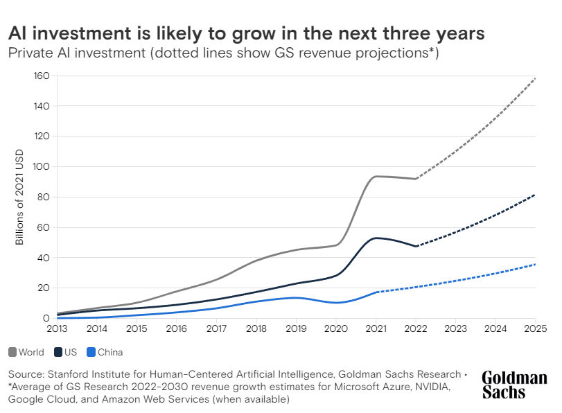"Während sich die KI-Investitionen bisher auf die Modellentwicklung konzentriert haben, wird für die Skalierung der generativen KI wahrscheinlich ein wesentlich größerer Hardware- und Softwareaufwand erforderlich sein", schreiben Briggs und Kodnani.