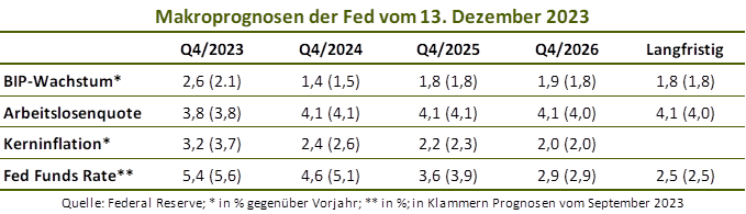 Fed hält zum dritten Mal stillWie erwartet hat die Fed die Leitzinsbandbreite bei 5,25% bis 5,50% belassen, dem höchsten Niveau seit 22 Jahren. Es handelt sich dabei um das dritte Stillhalten in Folge. Gleichzeitig haben die Währungshüter ihren Leitzinsausblick nach unten korrigiert. Hatte der Median der 19 FOMC-Mitglieder im September noch für Ende 2024 eine Fed Funds Rate von 5,1% veranschlagt, wird inzwischen mit 4,6% gerechnet. Mithin erwarten die Notenbanker nun im kommenden Jahr nicht nur Zinssenkungen um 50 Bp, sondern um 75 Bp. Für 2025 werden weitere 100 Bp an geldpolitischen Lockerungen unterstellt (vgl. nachfolgende Tabelle).