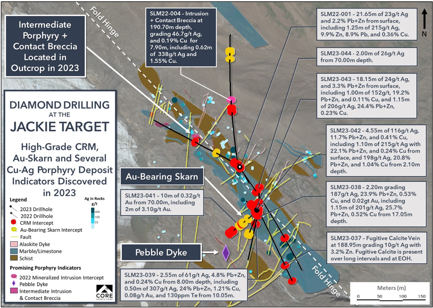 Mit acht kurzen Diamantbohrungen im Jahr 2023 auf den CRD-Zielen Jackie und Grizzly, die zum CRD-Porphyr-Projekt Silver Lime auf dem zentralen Grundstück Blue gehören, traf das Unternehmen oberflächennah in sieben von acht Bohrungen die erwartete massive und halbmassive Sulphidmineralisierung. Obwohl insgesamt wurden nur 965 Meter gebohrt wurden, lieferten die Bohrkerne erneut wichtige Rückschlüsse für das Modell eines großen, mineralisierten Porphyrs in der Tiefe. Das beste Bohrloch lieferte 4,55 Meter mit 116 g/t Ag, 11,7 % Pb+Zn und 0,41 % Cu auf dem Jackie Target.