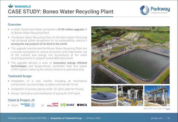 Durch den Erwerb der Tankweld Group gewinnt Parkway ganz neue Fähigkeiten bei der Abwicklung von Großprojekten, was die Kommerzialisierung seiner firmeneigenen Abwassertechnologie erleichtern dürfte. Durch operative Synergien und die größere kritischen Masse der kombinierten Gruppe kann Parkway künftig größere, komplexere Projekte bewältigen, die in der Regel margenstärker sind.