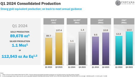 Fortuna Silver Mines (WKN: A0ETVA) meldete jüngst seine Produktions- und Finanzergebnisse für das erste Quartal 2024, die es wieder mächtig in sich hatten! Obwohl im Firmennamen Silber steht, fördert das Unternehmen wie bereits erwähnt auch Gold, Blei und Zink. Im Rahmen der Q1-Zahlen wurden 112.543 Unzen Goldäquivalent ausgewiesen, was einem Zuwachs von +20 % gegenüber dem Vorjahreszeitraum entspricht. Verteilt hat sich die Produktion hauptsächlich auf die Primär-Metalle Silber, mit rund 1,1 Millionen Unzen, und Gold, mit 89.678 Unzen.