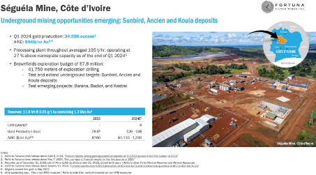 Die "Séguéla'-Mine , die Mine in der "Ramp up'-Phase, an der Elfenbeinküste besteht aus den Lagerstätten "Antenna', "Koula', "Agouti', "Boulder', "Ancien' und "Sunbird', die im Tagebau abgebaut werden. "Séguéla' verfügt über überzeugende wirtschaftliche Rahmenbedingungen und schon jetzt über Reserven, die für eine Lebensdauer der Mine von acht Jahren reichen. In den ersten sechs Jahren sollen durchschnittlich 133.000 Unzen Gold pro Jahr produziert werden. Bereits im vergangenen Jahr (2023) produzierte "Séguéla' bereits 78.617 Unzen Gold.